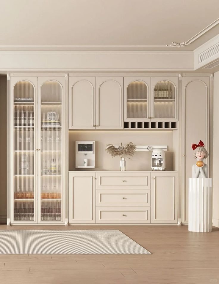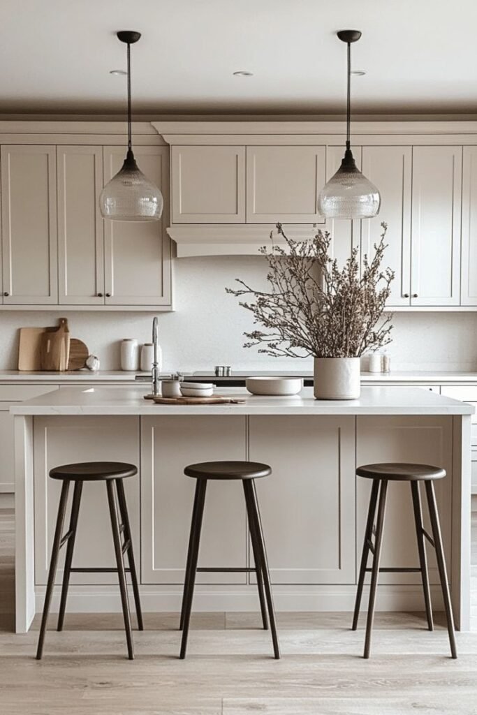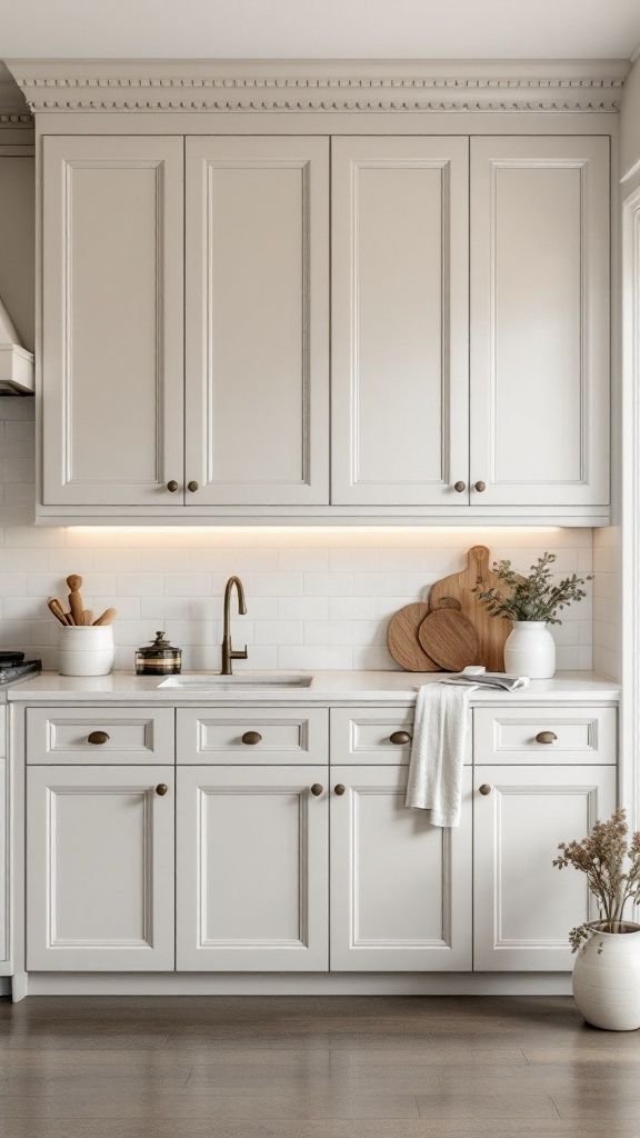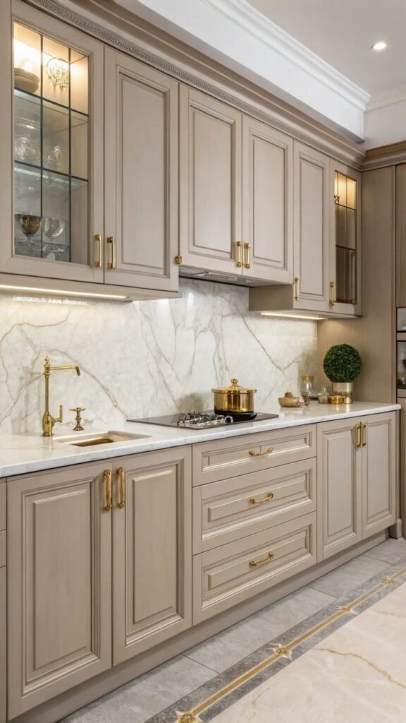 Neutral Color Palette: Creams, soft whites, beige, and warm browns accented with gold or bronze hardware.