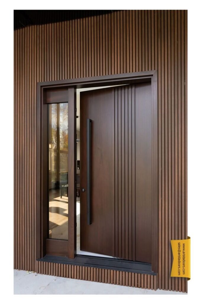 The door itself is a masterpiece of modern craftsmanship. Made from rich, natural wood with vertical grain, it brings warmth and tactility to an otherwise minimalist setting. Flanked by full-height glass panels, it allows soft light to filter into the interior, while the sleek black hardware offers a bold, clean finish.