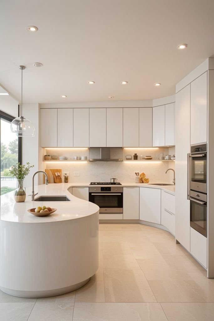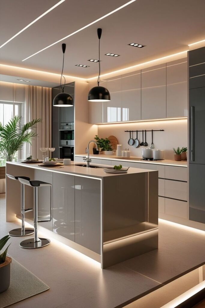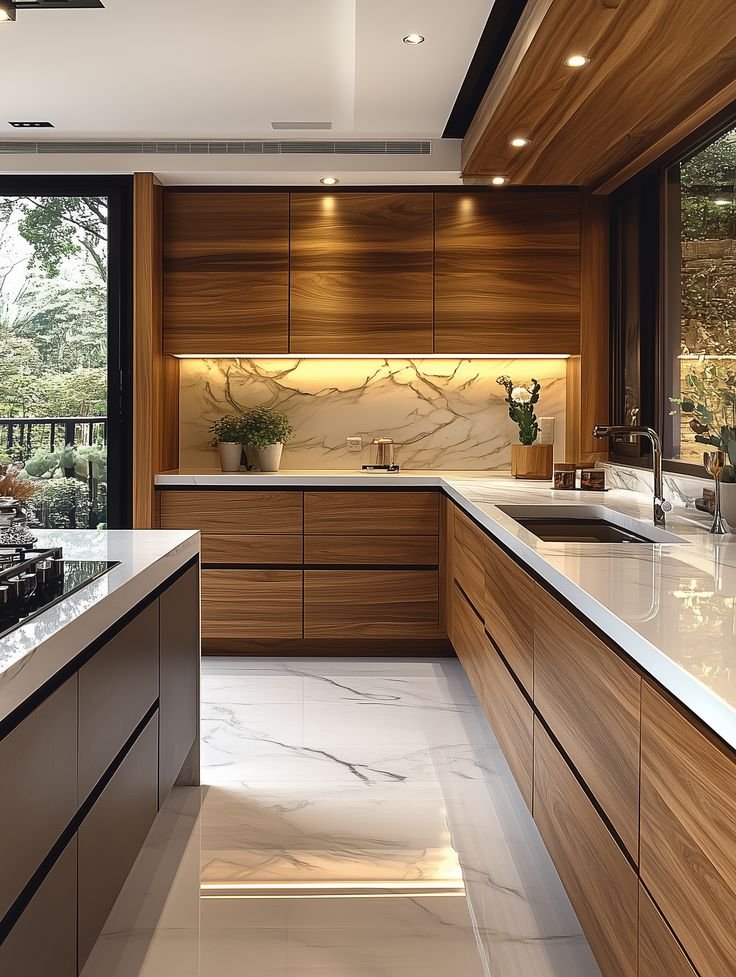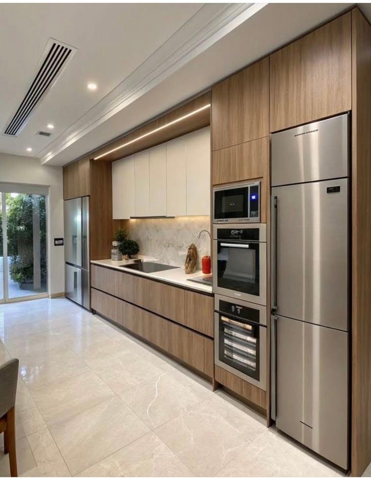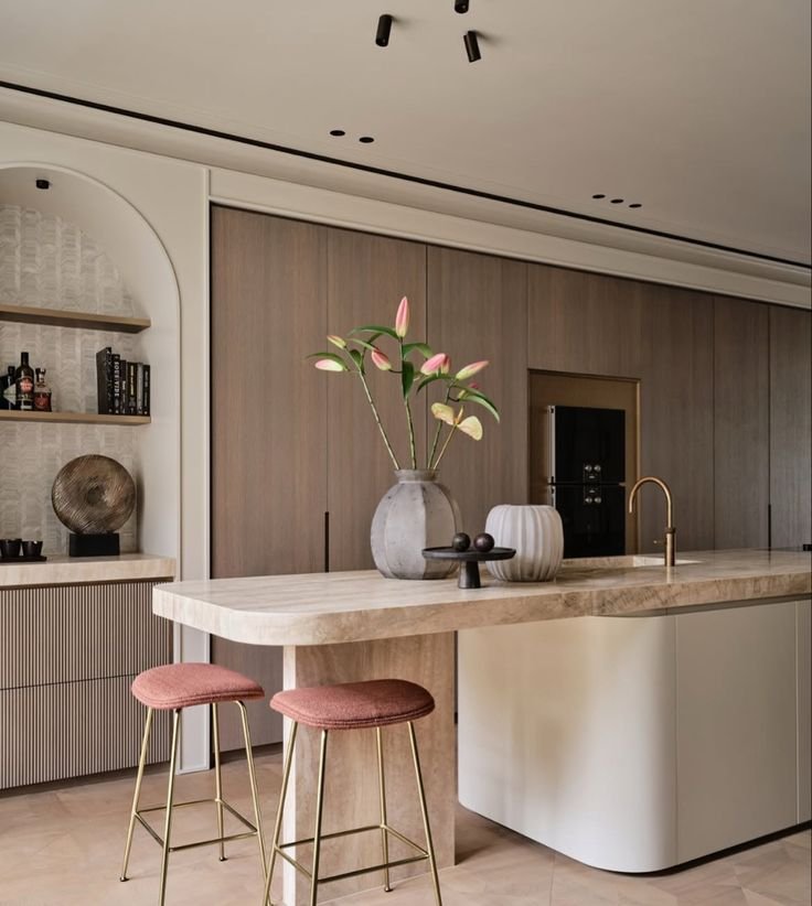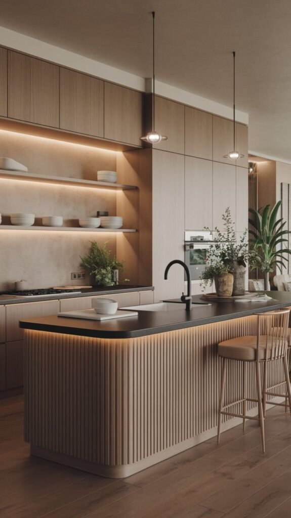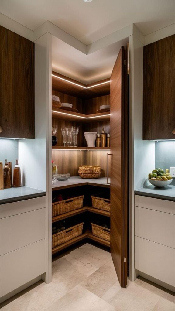 This hidden pantry concept beautifully blends form and function. Concealed behind a sleek wood-finish door, the corner pantry opens into a meticulously organized space with ambient lighting, open shelves, and wicker storage baskets. The walnut tones create warmth, while the seamless integration into the kitchen cabinetry ensures a clutter-free look. This design is perfect for modern homes that prioritize both elegance and efficiency. At The Creative Space, we design storage solutions that are visually appealing and practically brilliant.
